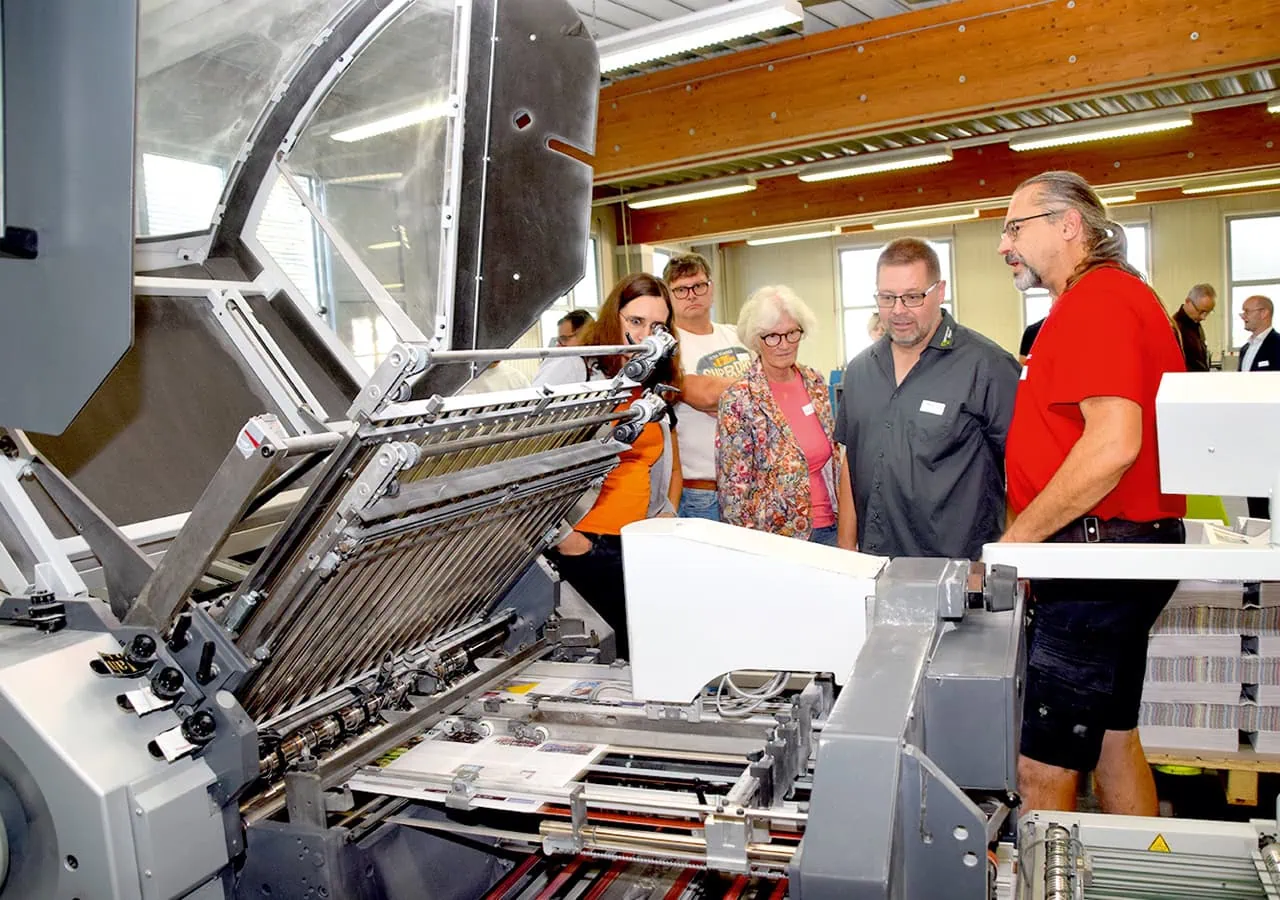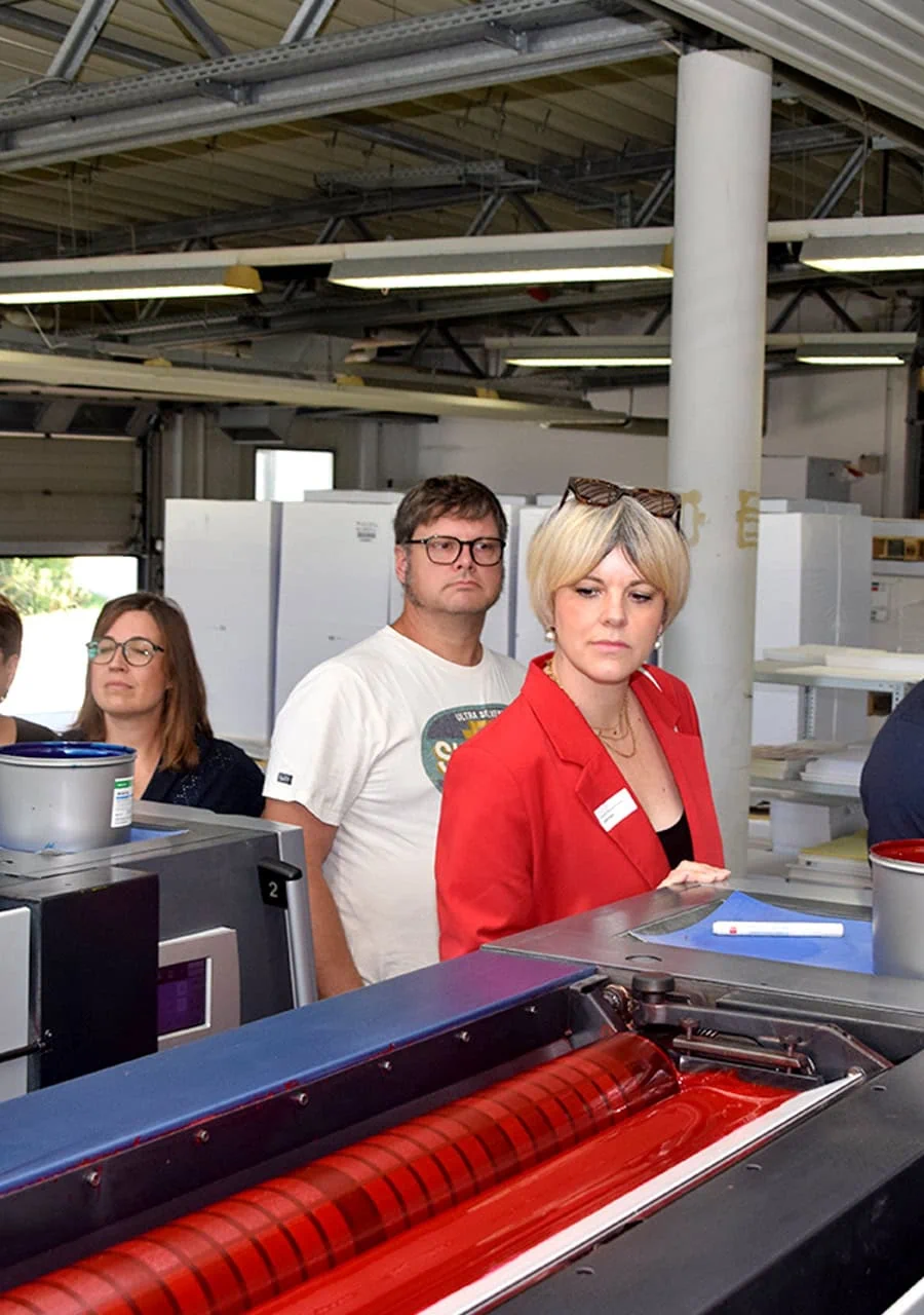 Die geladenen Unternehmer, Einzelhändler, Kreativen und Stadtoberhäupter konnten erleben, wie ROTOUR und so manch anderes Printprodukt entsteht. In kleinen Gruppen ging es auf Entdeckungsreise hinein in das Unternehmen. Obwohl das Rotabene-Medienhaus seit Jahrzehnten für qualitativ hochwertige Druckprodukte unterschiedlicher Anforderungen steht, hat der Blick in die Produktion so manchen überrascht. Von der Druckvorstufe, wo beispielsweise die Anzeigen für ROTOUR gestaltet, aber auch andere Magazine, Firmenprospekte, Flyer, Plakate, Etiketten, Roll-Ups und mehr kreativ entwickelt werden, ging es zur Plattenkopie. Hier verlässt die Drucksache erstmals die digitale Welt und wird als Druckplatte mit den Händen greifbar.