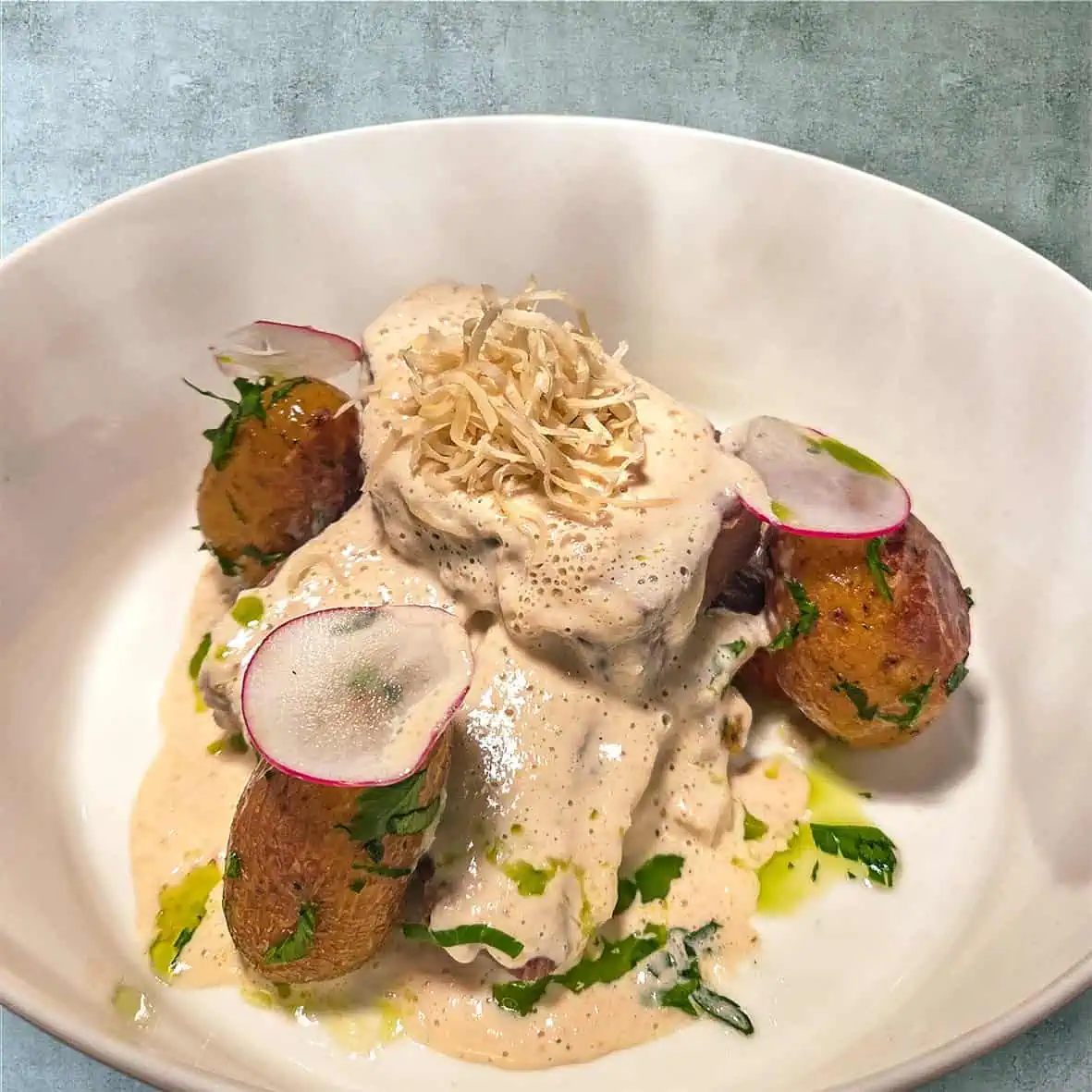 Gesottene Rinderbrust an Meerrettichschaum mit glasiertem Wurzelgemüse, Kräuteröl und Petersilien-Kartoffeln